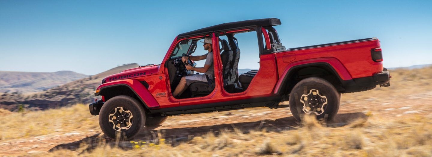 The Jeep Gladiator comes equipped with a range of modern safety, infotainment, and comfort features, as well as plenty of utilitarian features unique to Jeep. The cab has a drain plug for easy cleaning, and the roof and doors are removable in true Jeep fashion. The windshield folds down as well.